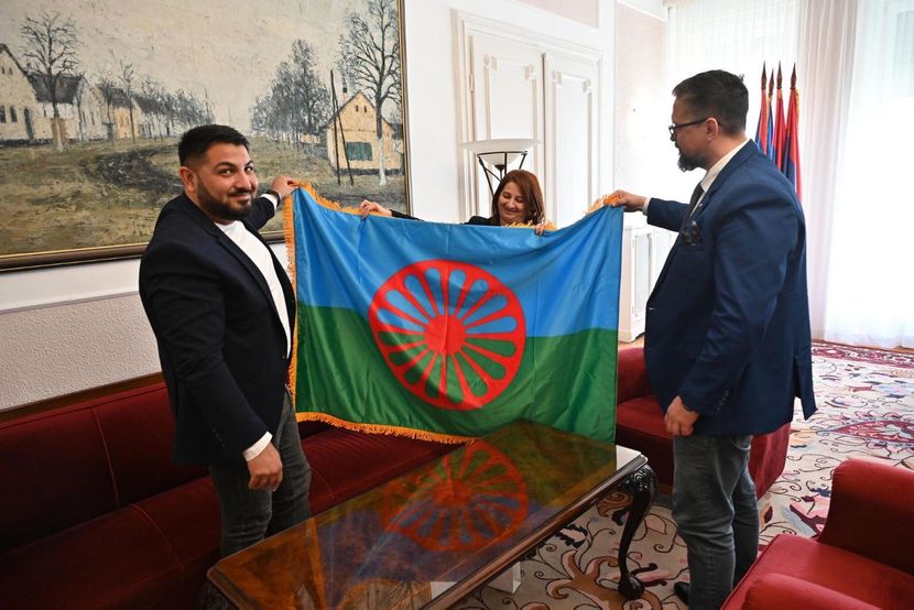 Pe agor e kidipnasko, e delegacia dende e prezidentosqe Juhas o flago e rromane nacionalne komunitetosqo, savo ka ovel sikavdo an-i Asamblea e AP Vojvodinaqi, paśal e flagoa e avere nacionalne komunitetenqe save si len pire konsile an-i pokrajina.